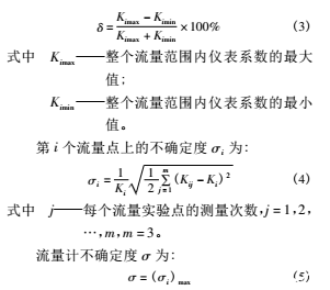 渦輪流量計的原理:當被測流體流過傳感器時,在流體作用下,葉輪受力旋轉,其轉速與管道平均流速成正比,葉輪的轉動周期改變磁電轉換器的磁阻值,檢測線圈中的磁通隨之發生周期性變化,產生周期性的感應電勢,即電脈沖信號。基于渦輪流量計的測量原理,根據渦輪流量計檢定規程,確定了實流實驗結果的評價指標,其中包括: 儀表系數、平均儀表系數相對誤差、線性度和不確定度。